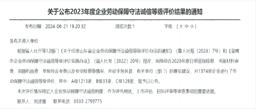 淄博市人力資源和社會保障局關于公布2023年度企業勞動保障守法誠信等級評價結果的通知