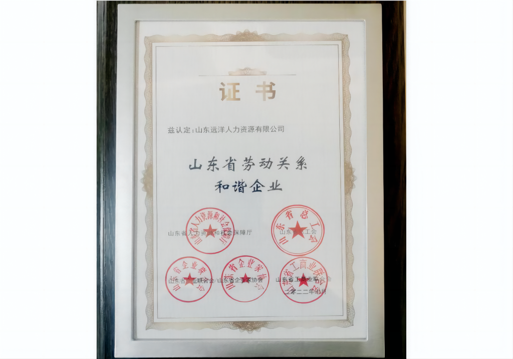 山東遠洋人力資源有限公司榮獲2022年山東省勞動關系和諧企業